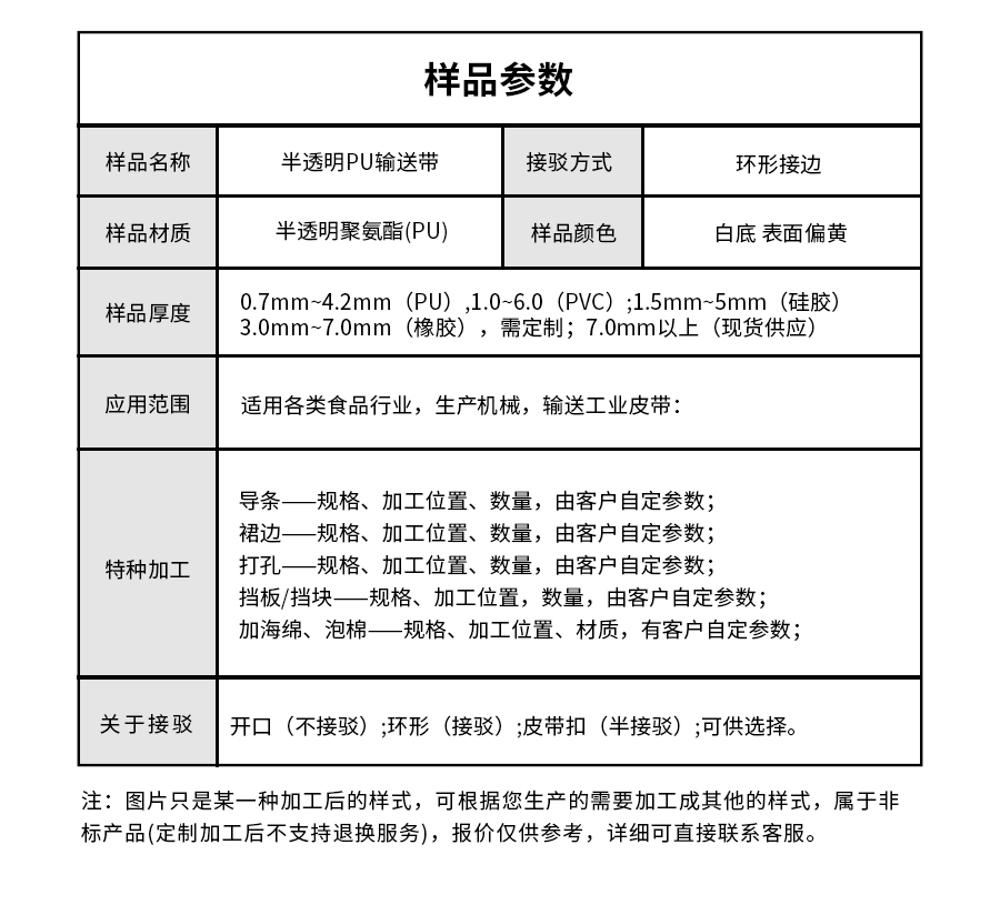 | 樣品名稱 | 半透明PU輸送帶 | 接駁方式 | 環(huán)形接邊 |