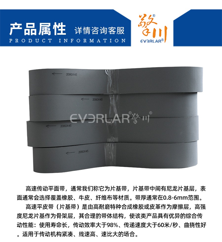 高速平皮帶(片基帶)是由高耐磨特種合成橡膠或皮革作為摩擦層,高強(qiáng)度尼龍片基作為骨架層,其合理的帶體結(jié)構(gòu),使該類產(chǎn)品具有優(yōu)異的綜合傳動(dòng)性能:使用壽命長(zhǎng),傳動(dòng)效率大于98%、傳遞速度大于60米/秒、曲撓性好。適用于傳動(dòng)機(jī)構(gòu)緊湊、線速高、速比大的場(chǎng)合。