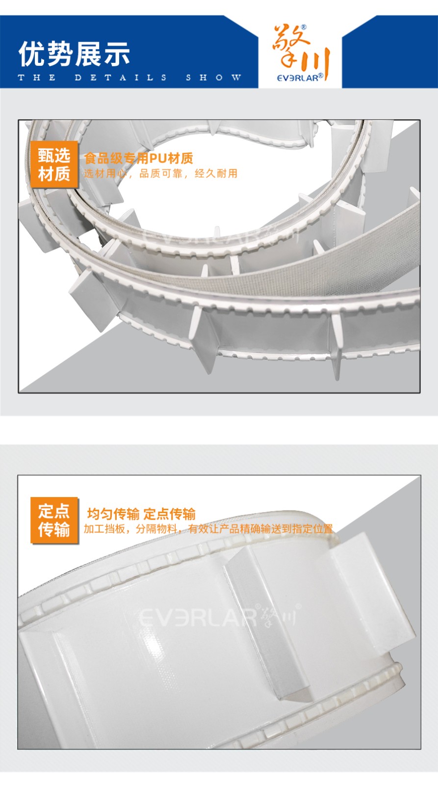 本樣品根據(jù)客戶行業(yè)需求加工定做,以PU輸送帶為底帶,加工擋板分格物料,均勻傳輸,帶子均勻承重,增加使用壽命。表面兩邊設(shè)計(jì)加工雙導(dǎo)條,減少物料掉落概率,高度匹配客戶使用。