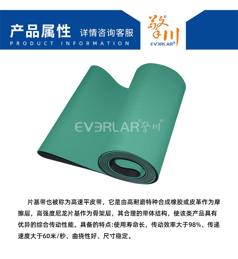 片基帶也被稱為高速平皮帶,它是由高耐磨特種合成橡膠或皮革作為摩擦層,高強度尼龍片基作為骨架層,其合理的帶體結(jié)構(gòu),使該類產(chǎn)品具有優(yōu)異的綜合傳動性能。具備的特點:使用壽命長,傳動效率大于98%、傳遞速度大于60米/秒、曲撓性好、尺寸穩(wěn)定。