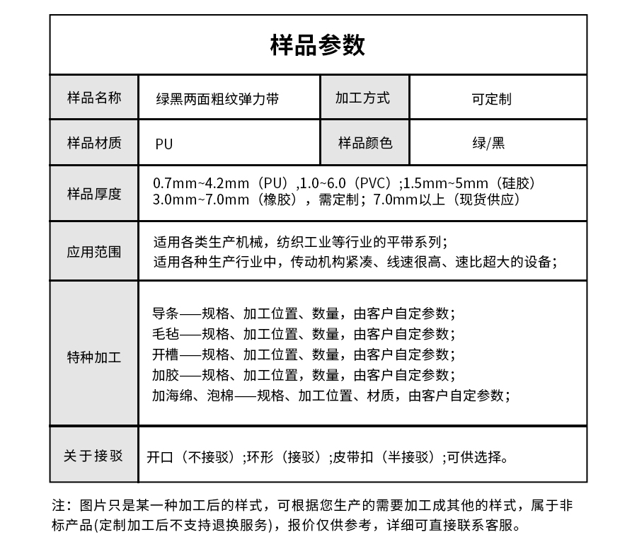 | 樣品名稱 | 綠黑兩面粗紋彈力帶 | 加工方式 | 定制 |