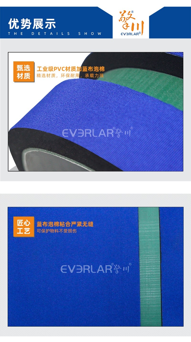 底帶厚度 | 0.7mm~4.2mm (PU) ,1.0~6.0 (PVC) ;1.5mm~5mm (硅膠)3.0mm~7.0mm ( 橡膠),需定制; 7.0mm以上(現(xiàn)貨供應(yīng)) | 應(yīng)用范圍 | 1、貼標(biāo)機做卷瓶帶使用,壓緊標(biāo)簽; 2、糊盒機..上用作壓盒帶; 3、電子元件的電鍍上用掩膜帶; |