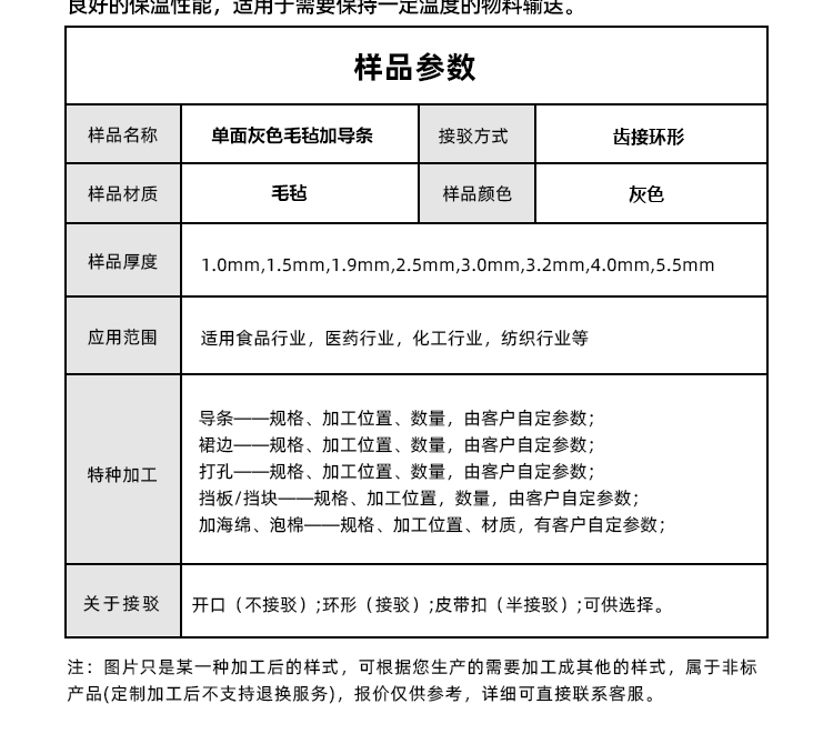 • 產(chǎn)品名稱:單面灰色毛氈加導條耐磨降噪平穩(wěn)工業(yè)皮帶