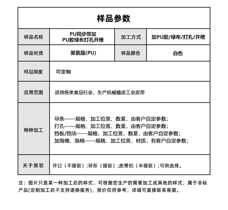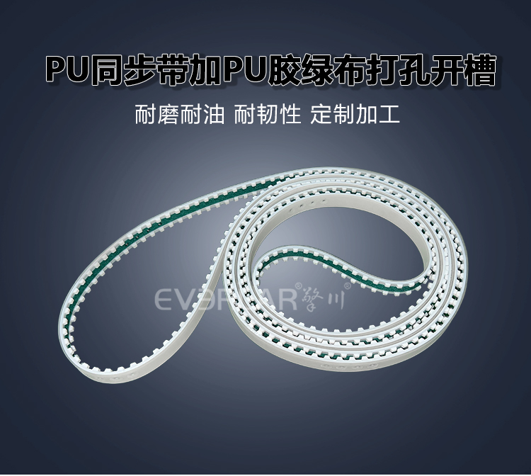 • 產(chǎn)品名稱:PU同步帶加PU膠綠布打孔開槽精準傳動防滑包裝機械聚氨酯工業(yè)皮帶定制
