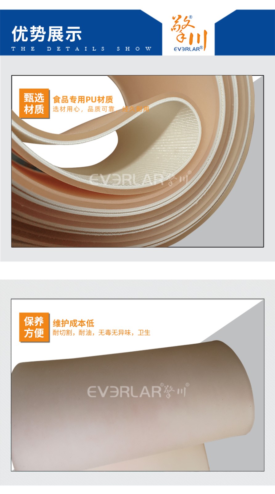 PU輸送帶也被稱為聚氨酯輸送帶,它是經(jīng)過處理的高強(qiáng)度人工合成聚氨酯作為承載骨架,涂覆層由聚氨酯樹脂制成。不但具有普通輸送帶的抗拉強(qiáng)度高、曲饒性好、輕、薄、韌等特點,而且耐油,容易清洗。在食品行業(yè)使用比較多,因此用在食品行業(yè)時也叫食品輸送帶。