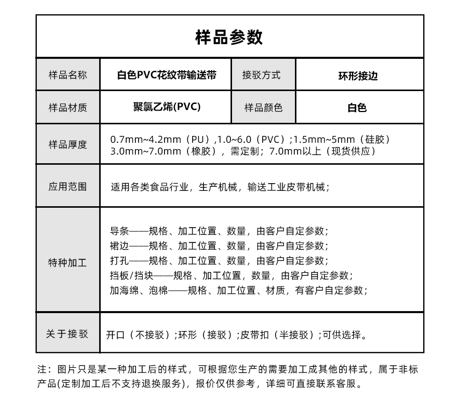 樣品名稱白色PVC花紋帶輸送帶接駁方式