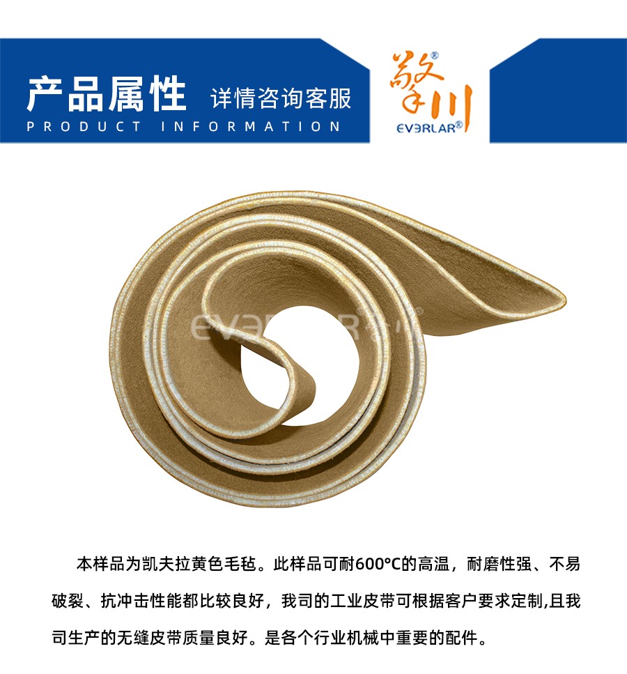 本樣品為凱夫拉黃色毛氈。此樣品可耐600°C的高溫,耐磨性強(qiáng)、不易破裂、抗沖擊性能都比較良好,我司的工業(yè)皮帶可根據(jù)客戶(hù)要求定制,且我司生產(chǎn)的無(wú)縫皮帶質(zhì)量良好。是各個(gè)行業(yè)機(jī)械中重要的配件。