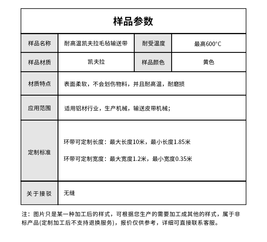 | 樣品名稱(chēng) | 耐高溫凱夫拉毛氈輸送帶 | 接駁方式 | 無(wú)縫接駁 |