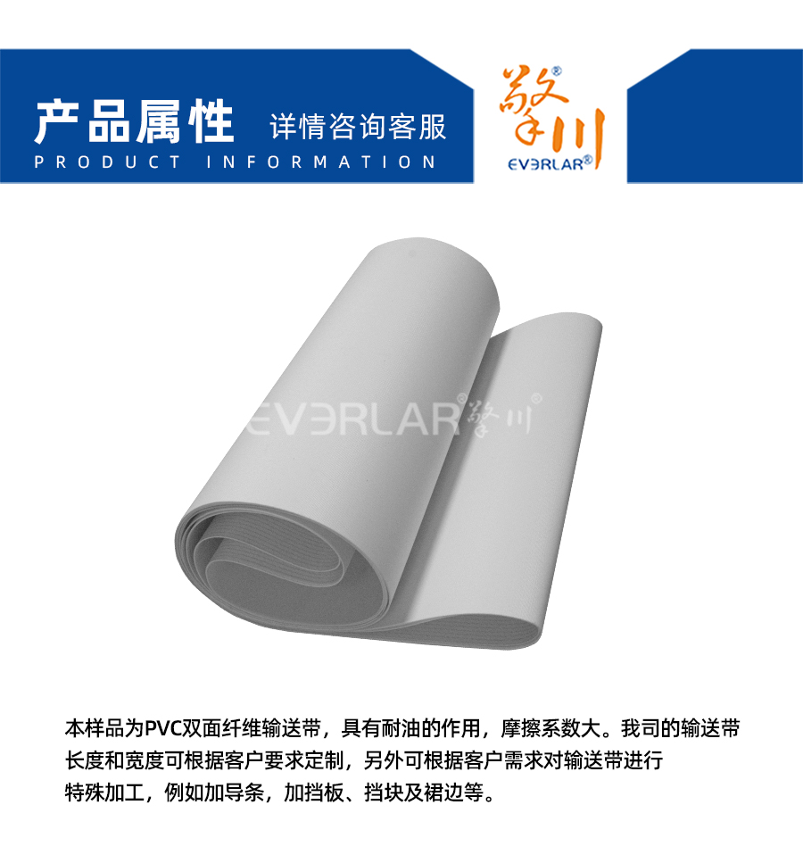 本樣品為PVC雙面纖維輸送帶,具有耐油的作用,摩擦系數(shù)大。我司的輸送帶長(zhǎng)度和寬度可根據(jù)客戶要求定制,另外可根據(jù)客戶需求對(duì)輸送帶進(jìn)行特殊加工,例如加導(dǎo)條,加擋板、擋塊及裙邊等。