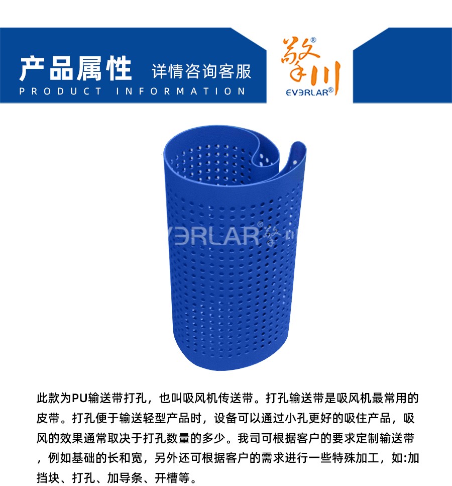 此款為PU輸送帶打孔,也叫吸風(fēng)機(jī)傳送帶。打孔輸送帶是吸風(fēng)機(jī)最常用的皮帶。打孔便于輸送輕型產(chǎn)品時(shí),設(shè)備可以通過小孔更好的吸住產(chǎn)品,吸風(fēng)的效果通常取決于打孔數(shù)量的多少。我司可根據(jù)客戶的要求定制輸送帶例如基礎(chǔ)的長和寬,另外還可根據(jù)客戶的需求進(jìn)行- -些特殊加工,如:加擋塊、打孔、加導(dǎo)條、開槽等。