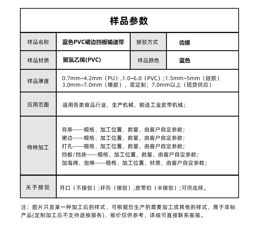 | 樣品名稱 | 藍色PVC輸送帶加擋板裙帶 | 加工方式 | 加擋板、加裙邊 |