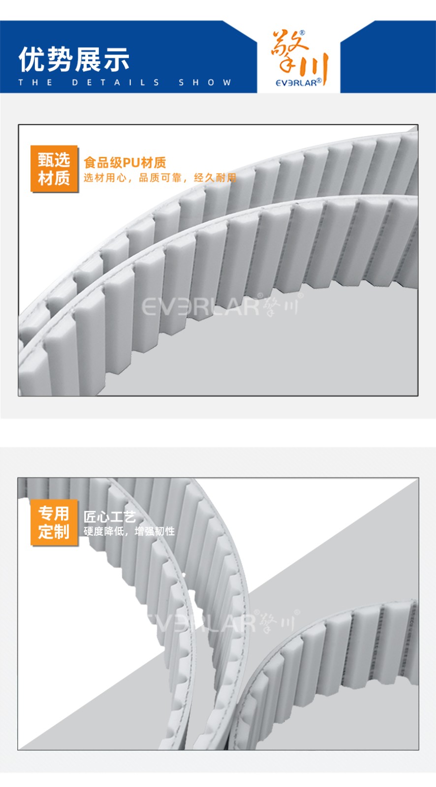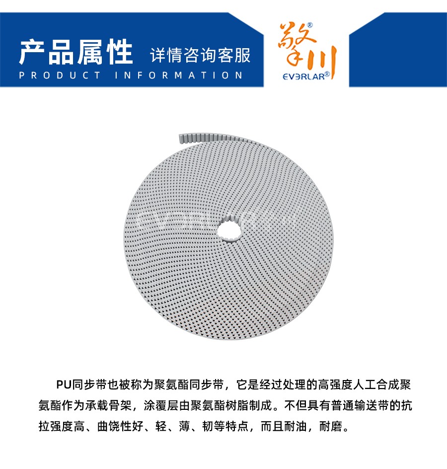 PU同步帶也被稱為聚氨酯同步帶,它是經(jīng)過處理的高強度人工合成聚氨酯作為承載骨架,涂覆層由聚氨酯樹脂制成。不但具有普通輸送帶的抗拉強度高、曲饒性好、輕、薄、韌等特點,而且耐油,耐磨。