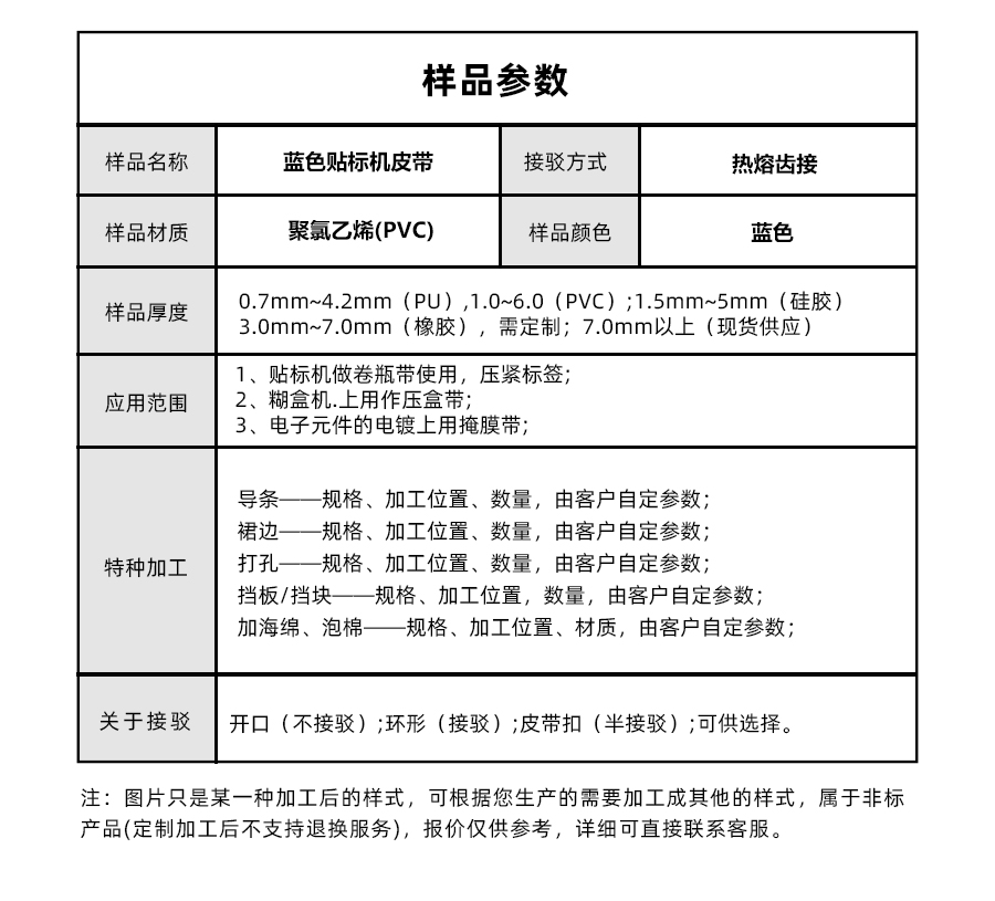 | 樣品名稱 | 藍色貼標(biāo)機皮帶 | 接駁方式 | 熱熔齒接 |