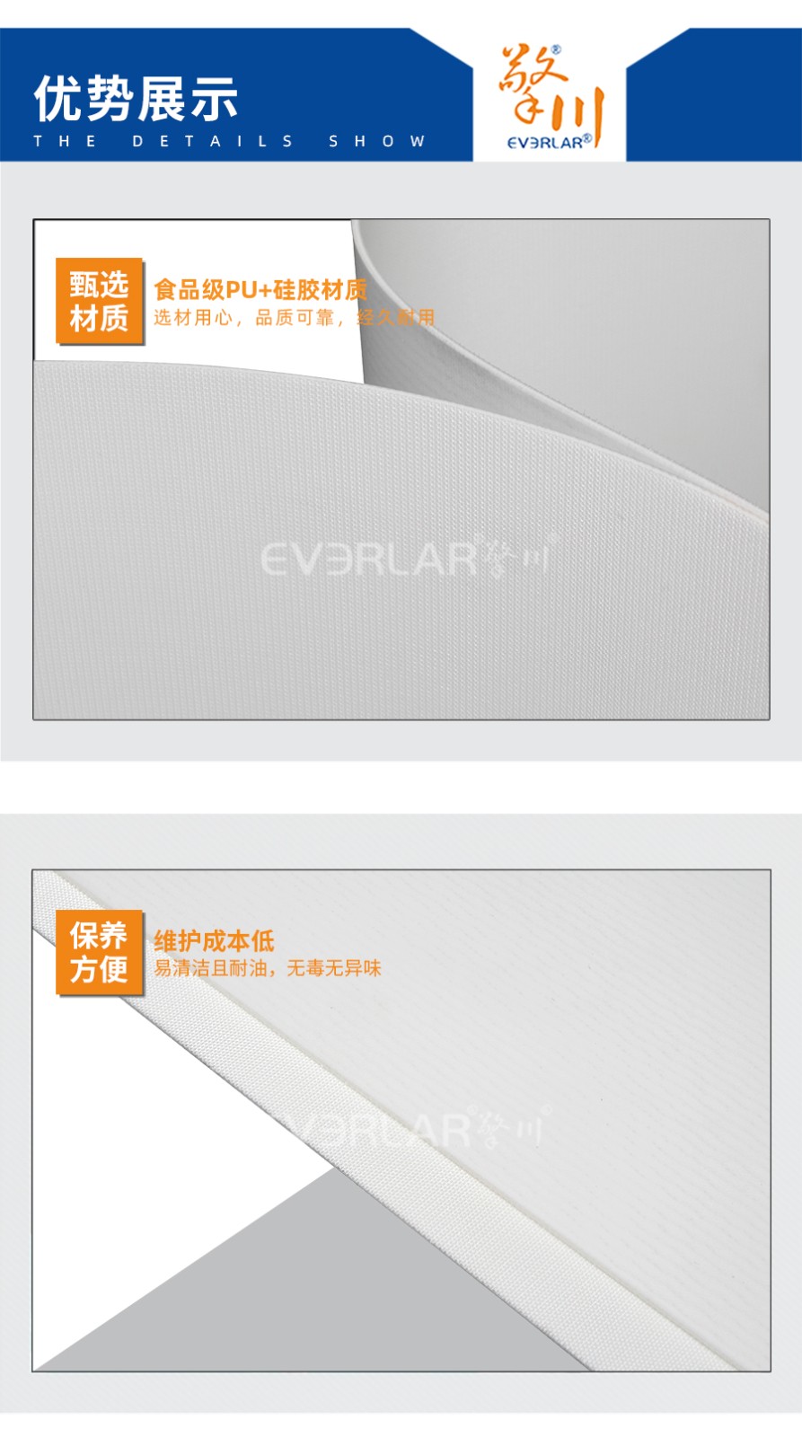 • 產(chǎn)品名稱:擎川everlar定制白色半硅膠輸送帶食品輸送帶