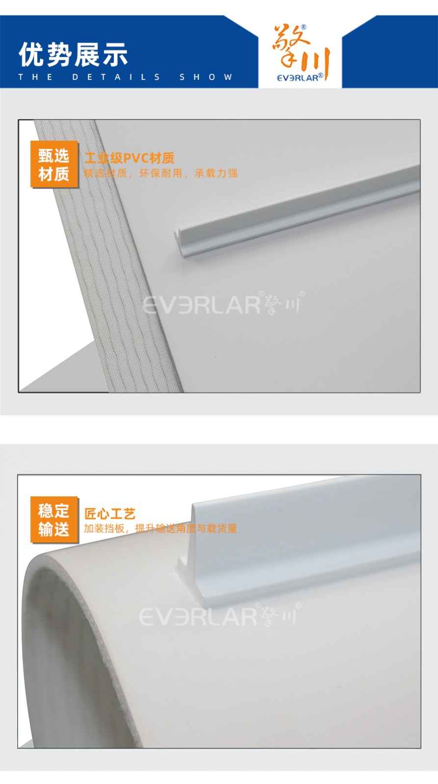 • 產(chǎn)品名稱:擎川everlar定制PVC輸送帶白色加擋板