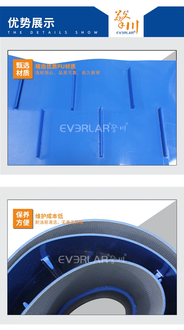 • 產(chǎn)品名稱:藍色PU輸送帶加擋板耐磨耐油耐腐蝕工業(yè)皮帶定制