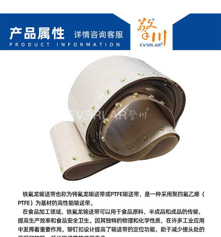 • 產(chǎn)品名稱:特氟龍輸送帶加鉚釘扣耐腐蝕耐高溫易清潔工業(yè)皮帶定制