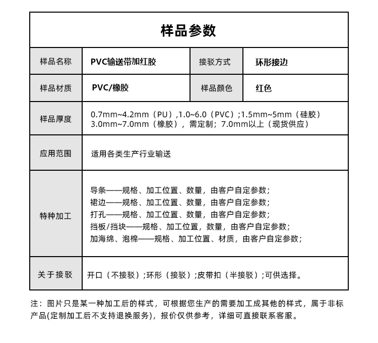 • 產(chǎn)品名稱:PVC輸送帶加紅膠耐磨耐油抗壓強(qiáng)度高工業(yè)皮帶