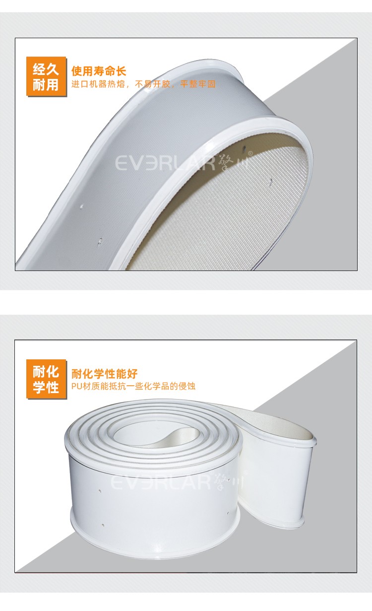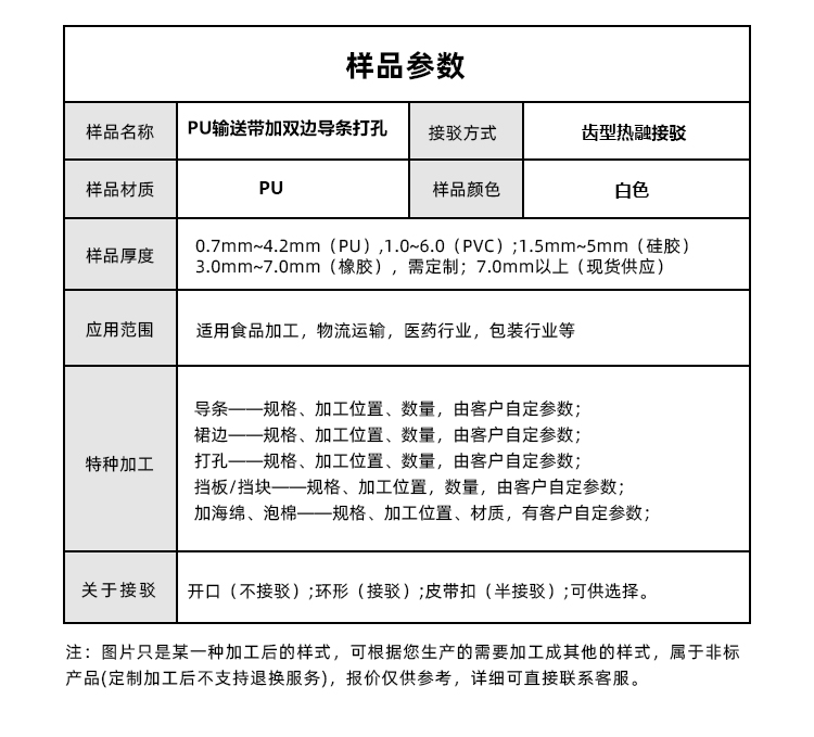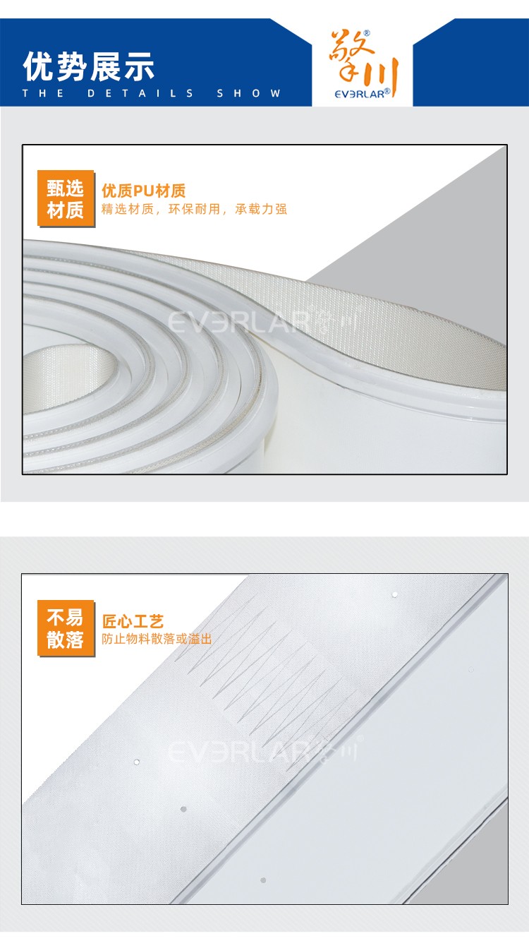 • 產(chǎn)品名稱:白色PU輸送帶加雙邊導(dǎo)條打孔耐磨耐油抗拉力強(qiáng)工業(yè)皮帶