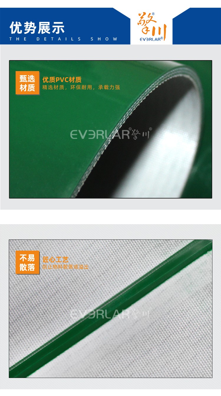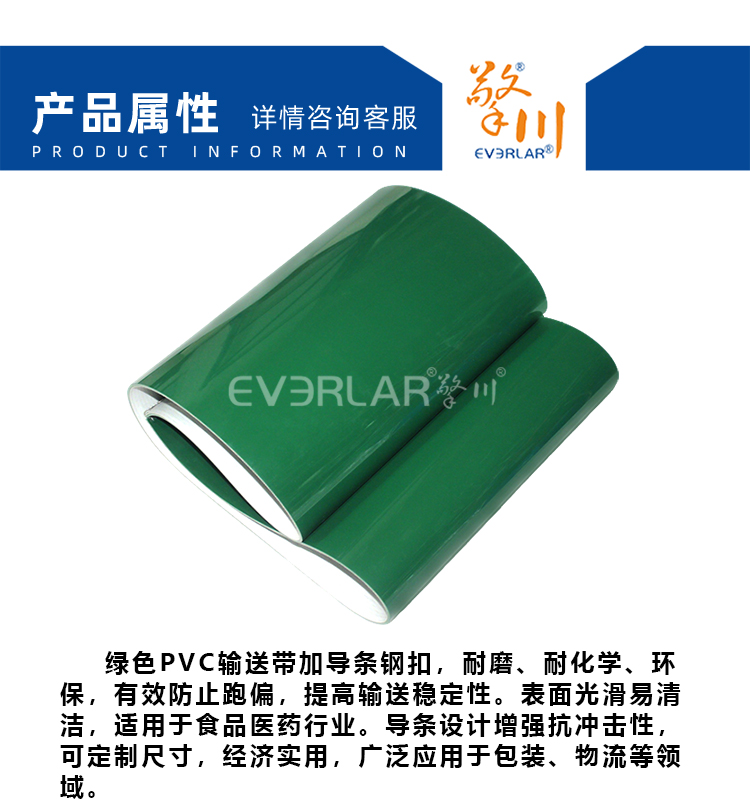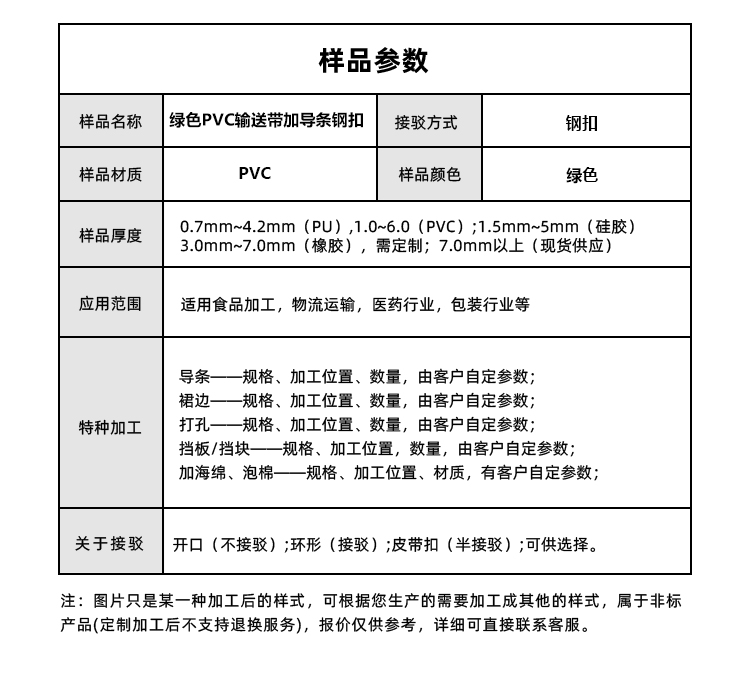 • 產(chǎn)品名稱:綠色PVC輸送帶加導條鋼扣防滑食品加工行業(yè)生產(chǎn)線皮帶定制