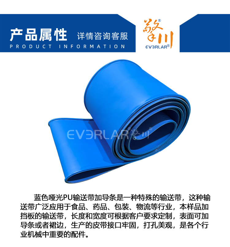 • 產(chǎn)品名稱:PU輸送帶加導條耐磨耐油食品級藍色啞光傳送帶食品包裝生產(chǎn)線皮帶