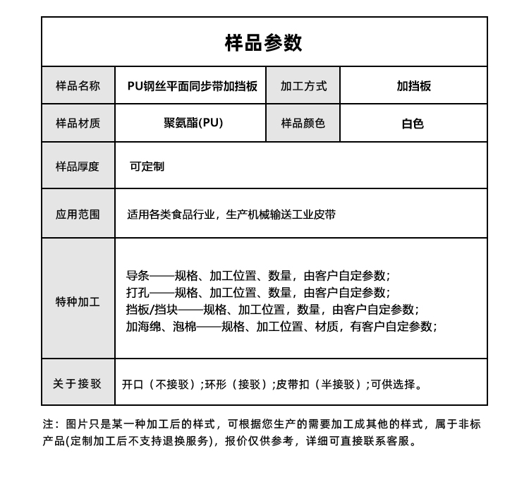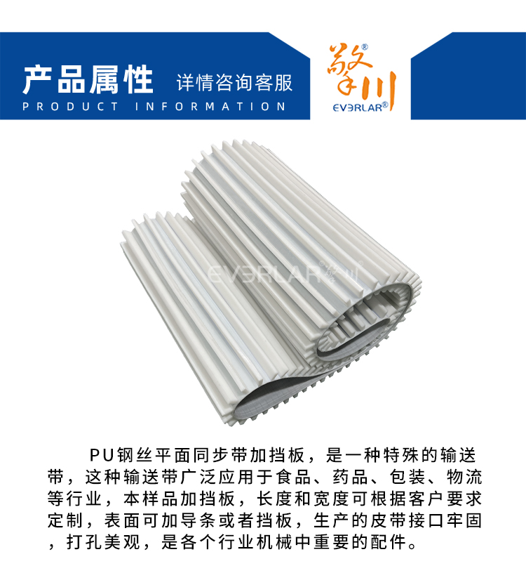 產(chǎn)品名稱:白色聚氨酯鋼絲平面同步帶加擋板物流包裝耐磨耐油PU傳動(dòng)帶工業(yè)皮帶