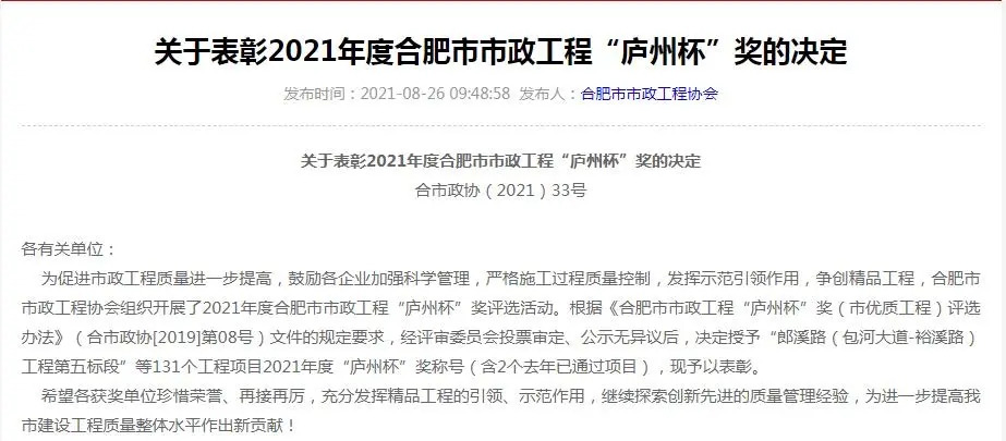 此獎的獲得,是合肥市人民政府、合肥市市政工程協(xié)會對集團(tuán)公司承建工程質(zhì)量的充分肯定,集團(tuán)公司將繼續(xù)嚴(yán)格把控工程質(zhì)量,高標(biāo)準(zhǔn)、高要求狠抓項(xiàng)目精細(xì)化管理,力爭打造更多優(yōu)質(zhì)工程。